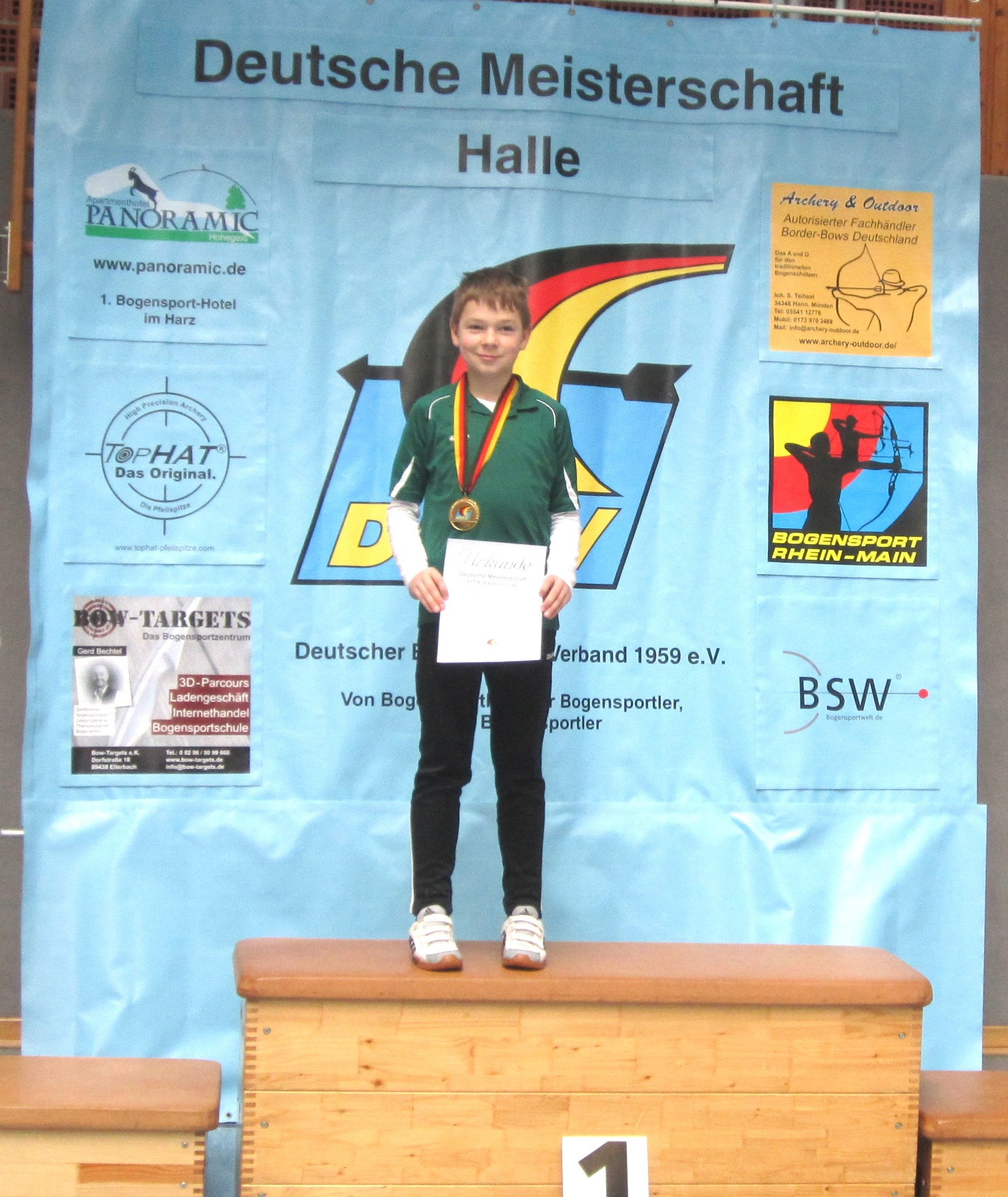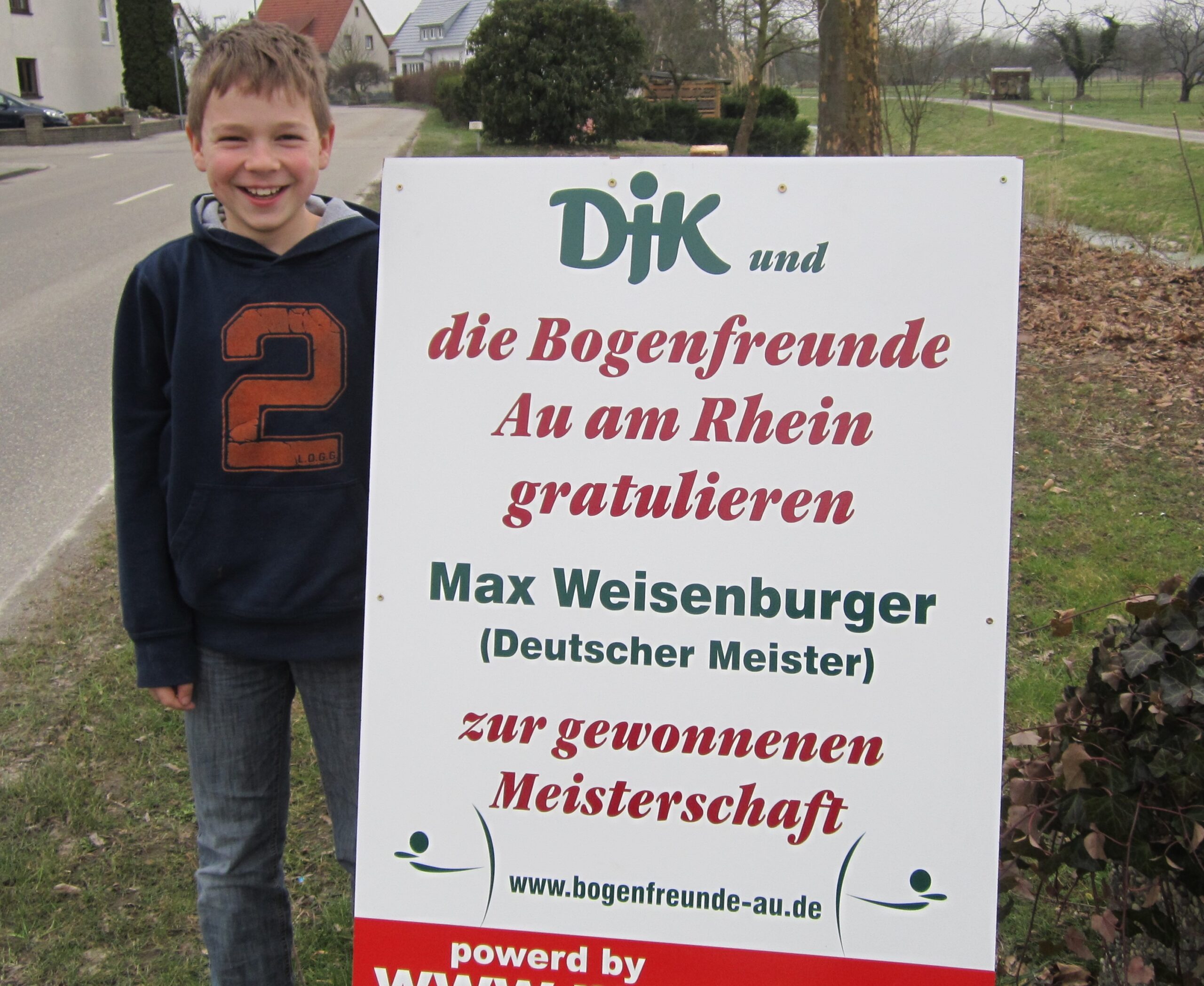 Die Bogenfreunde der DJK Au am Rhein feiern erneut einen Deutschen Meister! Am 23. März 2013 fand in Seehausen (Sachsen-Anhalt) die Deutsche Hallenmeisterschaft des Deutschen Bogensport-Verbandes für Bögen ohne Visier statt. Aufgrund der frühen Wettkampfzeiten erfolgte die 660 km lange Anreise bereits am Vortag. Mit Anna-Celine Bauer und Max Weisenburger (U12) sowie Jonas Ullmann (U14) gingen drei Nachwuchsschützen der DJK an den Start. In zwei spannenden Durchgängen mit jeweils 30 Pfeilen auf 18 Meter zeigten sie ihr Können. Max Weisenburger krönte sich mit starken 459 Ringen zum Deutschen Meister. Anna-Celine Bauer verpasste mit Platz 4 knapp das Podium, während Jonas Ullmann einen respektablen 6. Platz belegte. Die DJK gratuliert allen Schützen zu diesen großartigen Leistungen!